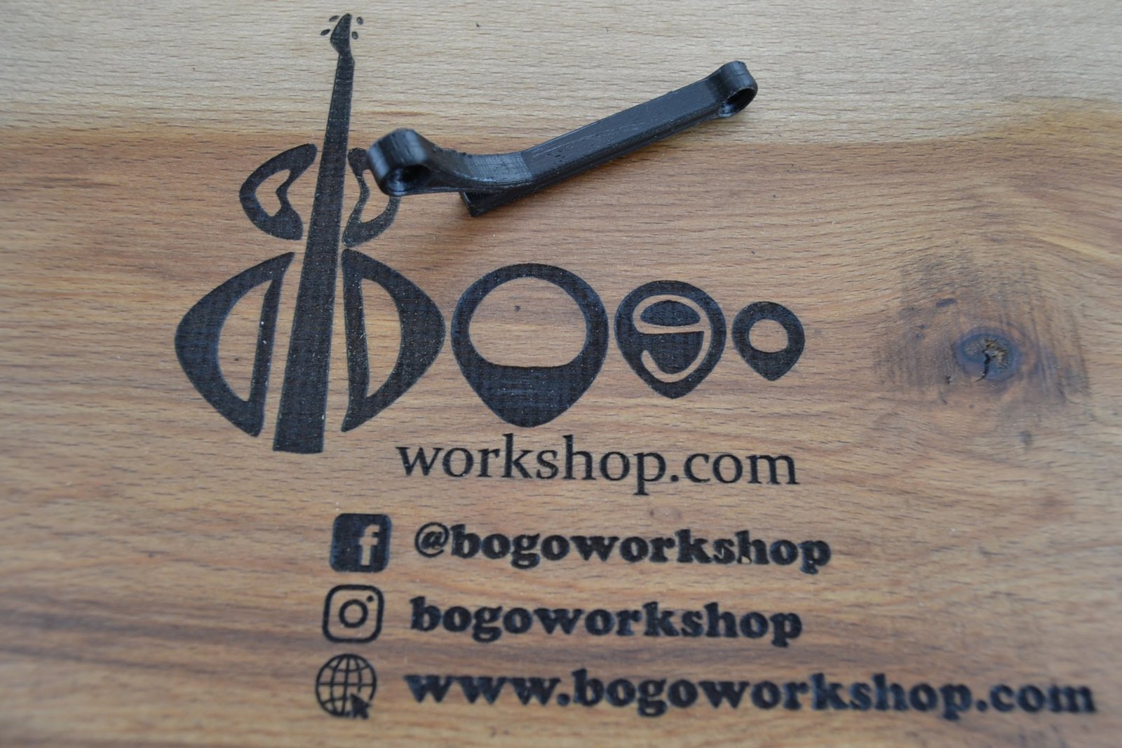 Thumb rest is made of plastic, 3D print. Screws holes distance 67.507mm. Mounting without drilling extra holes on existing pickguard holes.
