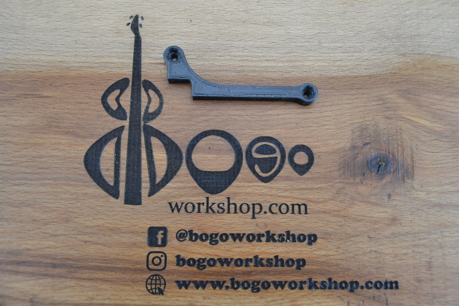 Thumb rest is made of plastic, 3D print. Screws holes distance 67.507mm. Mounting without drilling extra holes on existing pickguard holes.