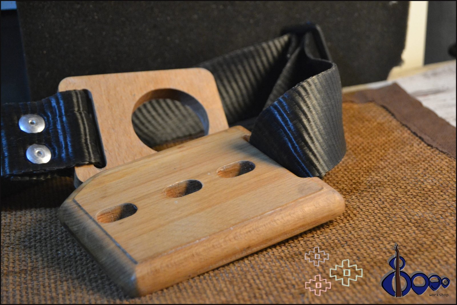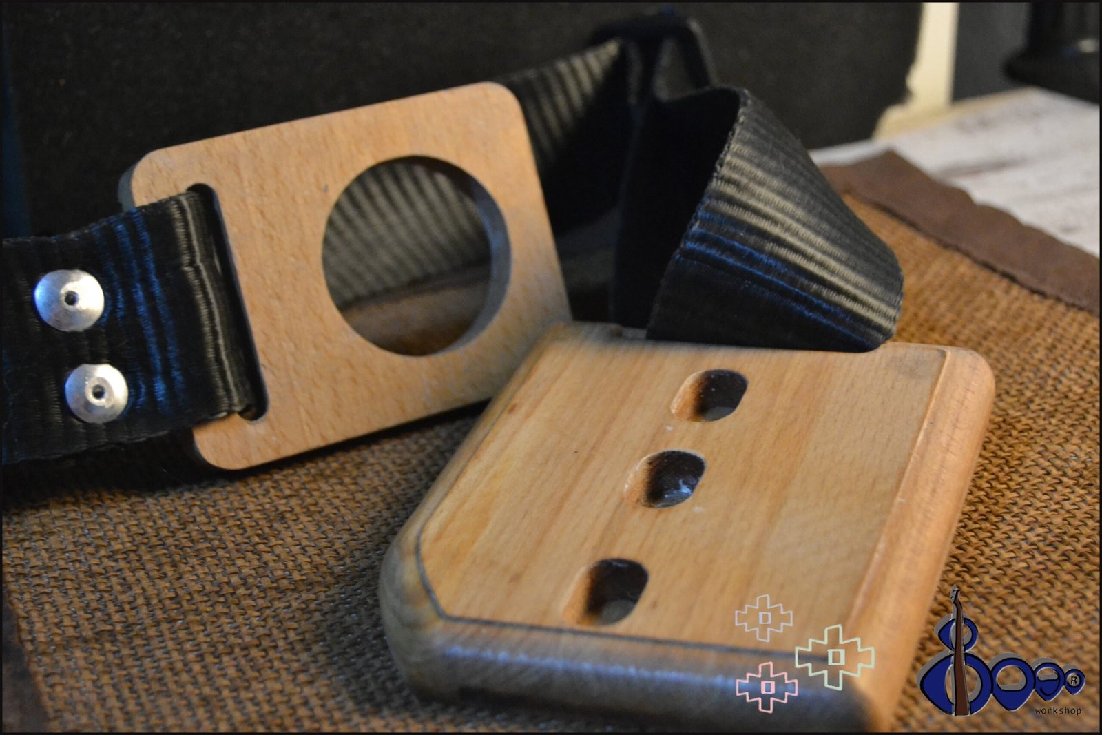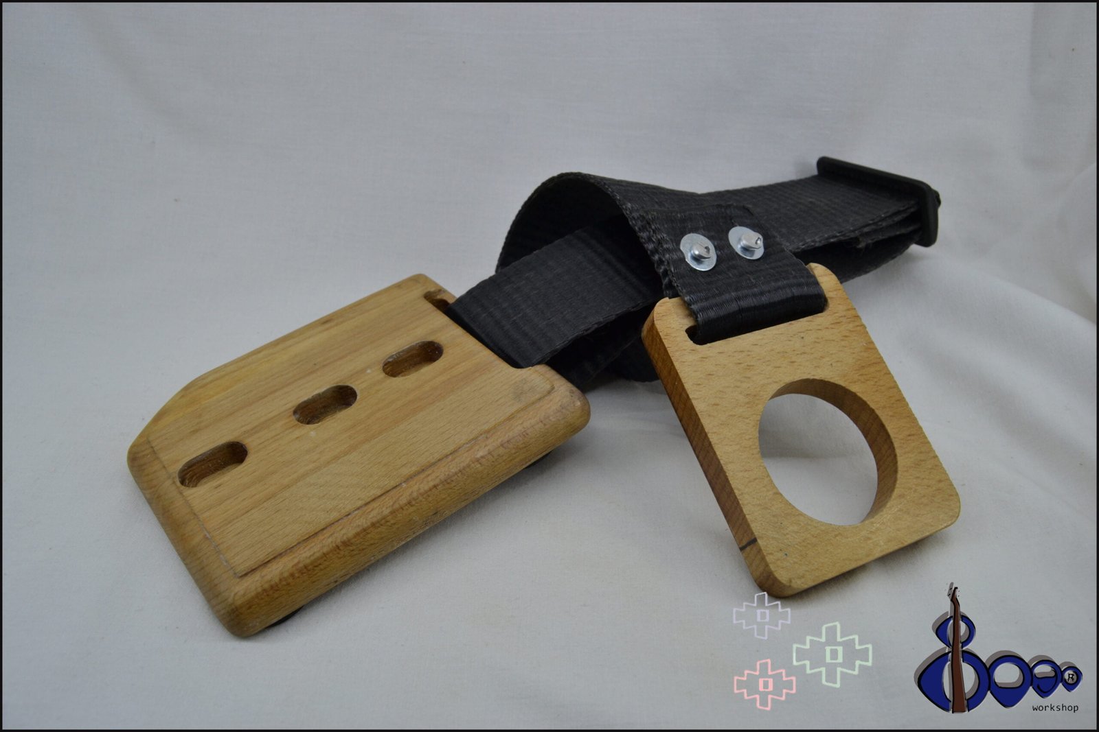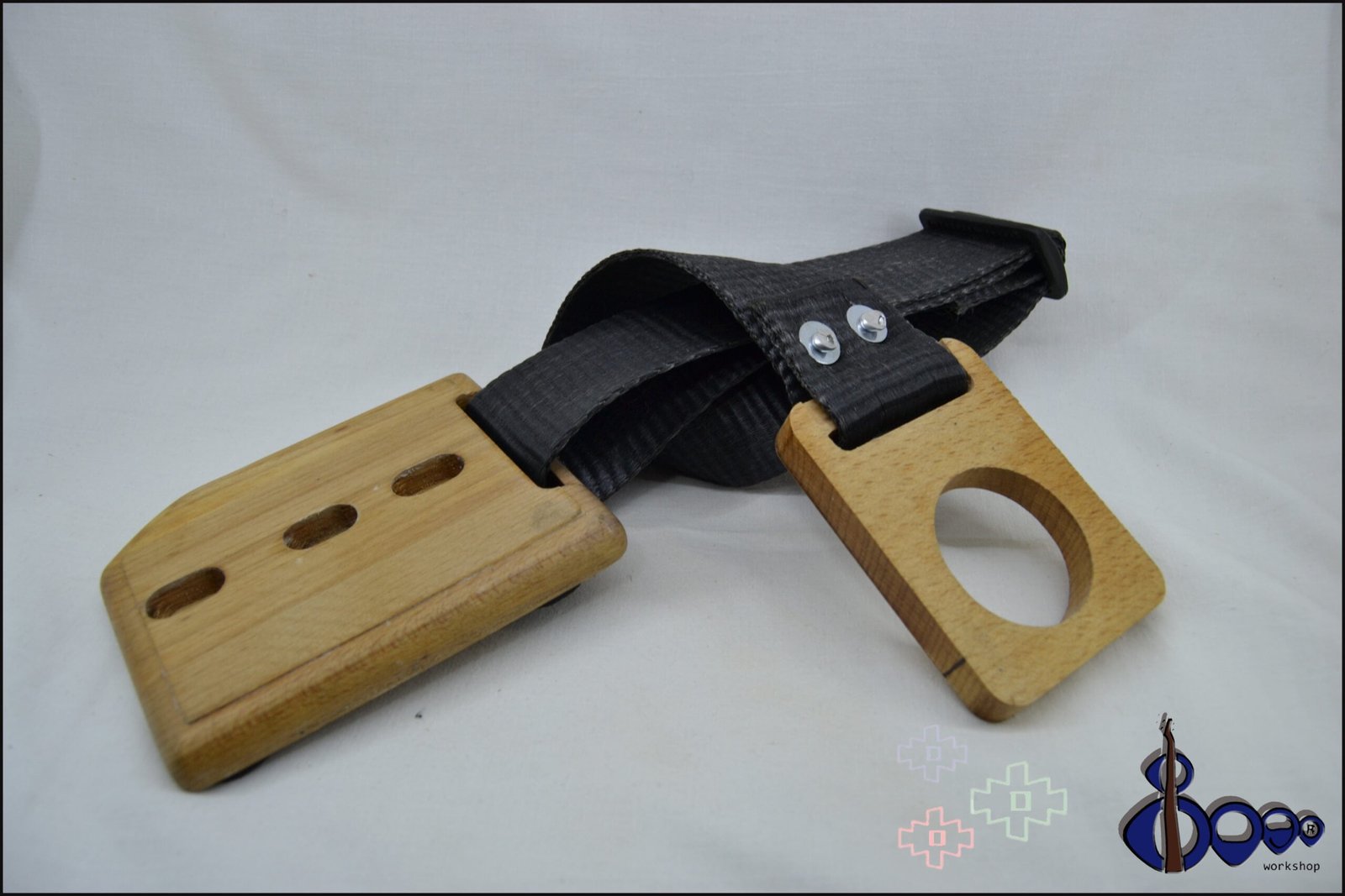 1. Take the wooden part of the adjustable strap and place the hole around the leg of a chair.